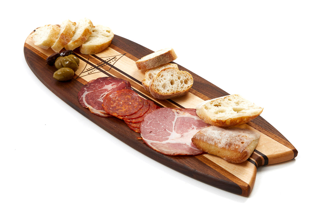 Surv in Style with the BIG FISH SURVBOARD. Beautifully handcrafted in Santa Barbara, CA from select certified premium hardwoods from responsibly managed forests. The board is equally as useful as a serving board and a cutting board. It will add a coastal feel to any kitchen, dining room, patio or picnic. Cut on one side and serve on the other. Whether your having a cheese platter and wine at the beach, need a cutting or chopping board for the kitchen or simply want a cool serving platter to serve your guests, the BIG FISH SURVBOARD has you covered!